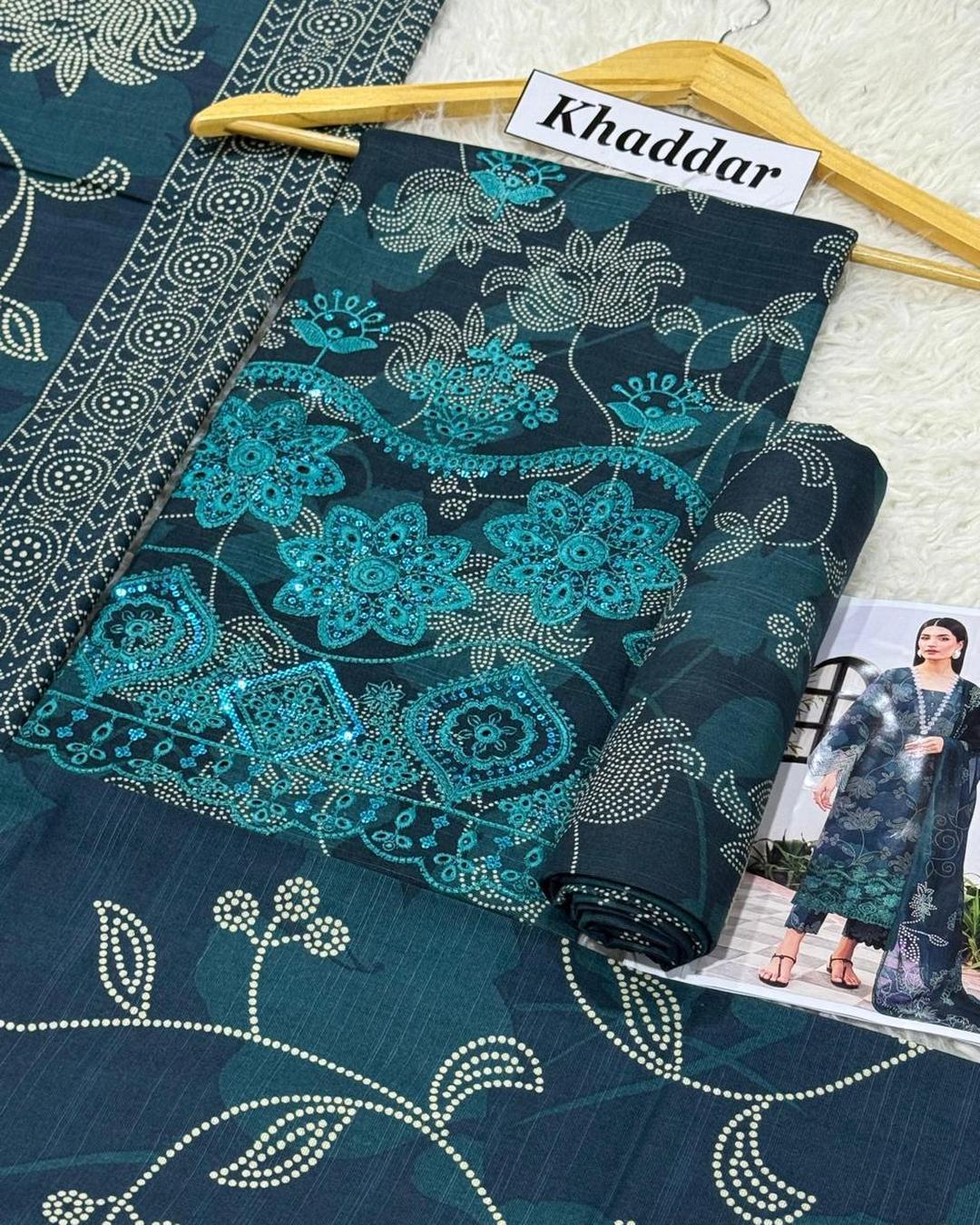 Fabric & Season: Khaddar 3-piece unstitched suit, ideal for winter wear.