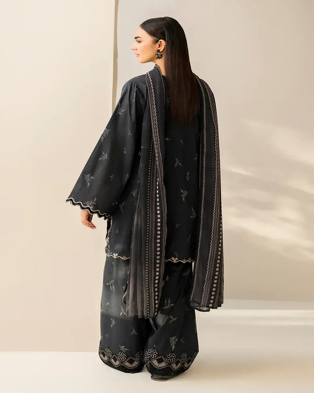 Digitally printed Khaddar 3-piece suit with embroidered organza patches for a refined winter look. Ideal for daytime outings and casual gatherings.